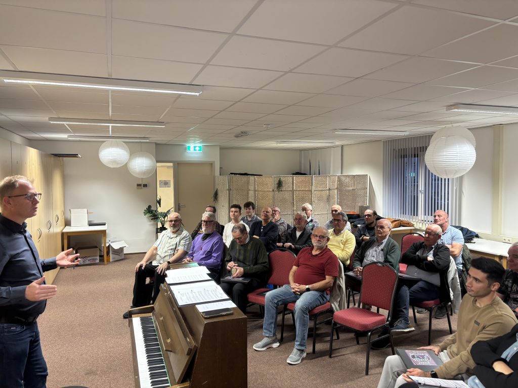 Na wat uitdagingen voor sommigen om een goede parkeerplek te vinden, starte de korte introductie, waarna al snel de keeltjes aangezwengeld werden. Dit d.m.v. de stemtest om te kijken of je bij de hoge of de lage stem hoort en dus aan welke kant je mocht gaan zitten.