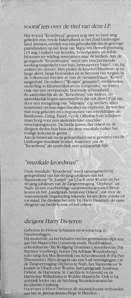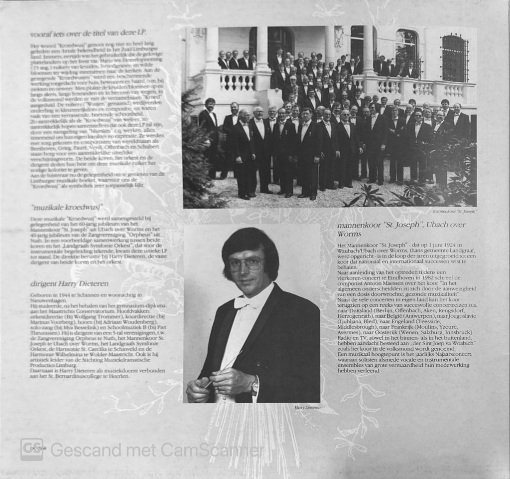 Het betrof de LP die ter ere van het 60-jarig lustrum van het Landgraafs Mannenkoor St.-Joseph, toen onder leiding van Harry Dieteren (de vader van Guido Dieteren). Het was in samenwerking met zangvereniging Orpheus uit Nuth (vierden ook hun eigen lustrum: 40 jaar) en het Landgraafs Symfonie Orkest, beide óók onder leiding van dezelfde Harry Dieteren. De titel van de LP is: ‘Een muzikale “kroedwusj”‘.