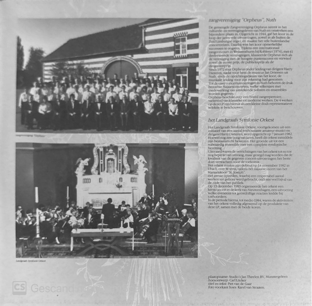 Onderaan dit verhaal heb ik een Youtube-afspeellijst geplaatst met de 4 liederen van het LMK. De muziek van zangvereniging Nuth heb ik vooralsnog niet gedigitaliseerd, mede omdat dit niet zonder toestemming gepubliceerd kan/mag worden. Ook staan er de nodige foto’s van de hoes van de LP, inclusief wat mooie teksten die daarin gedrukt zijn.